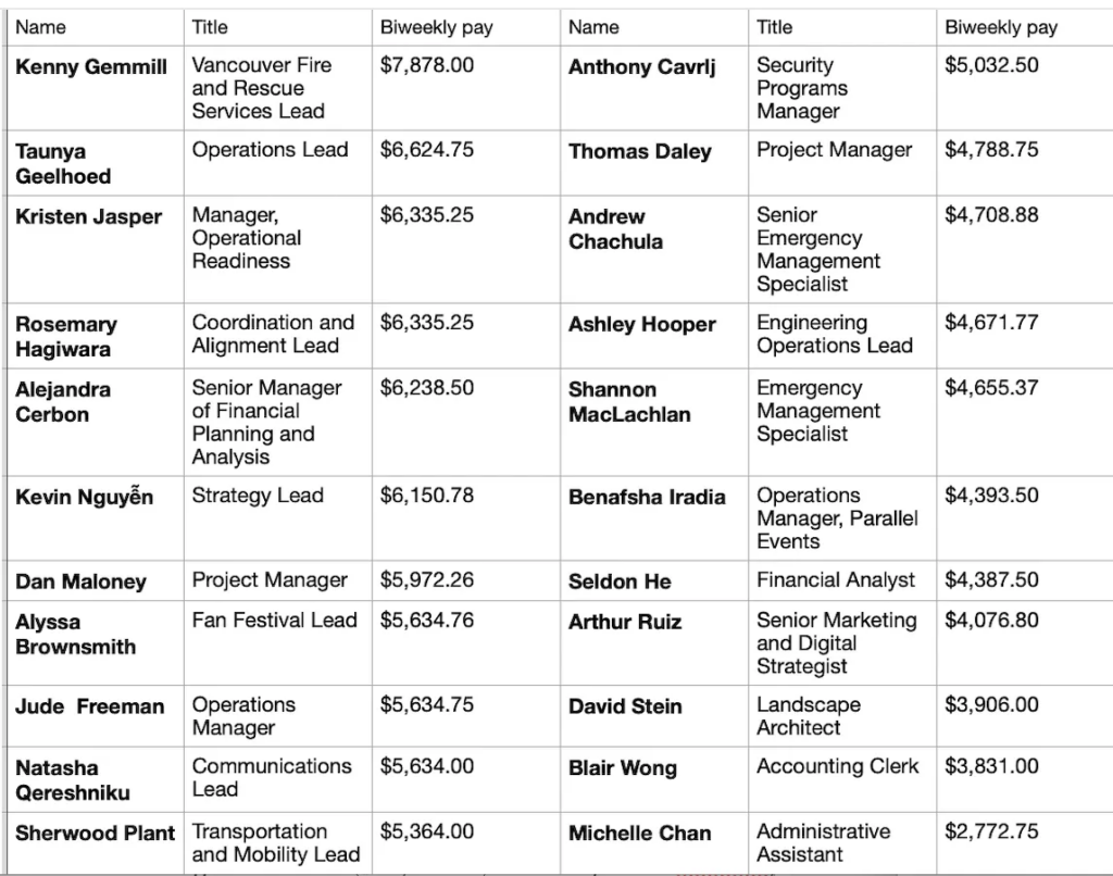 More than a dozen people working in Vancouver city hall’s FIFA World Cup secretariat are paid in excess of $10,000-a-month, according to a November payroll report obtained by theBreaker.news.