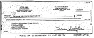 Cheque from Epstein’s JEGE LLC account in the Virgin Islands to Vancouver International Airport Authority for $169.93.