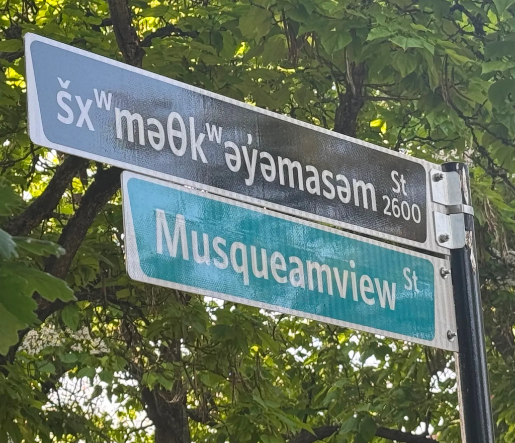 theBreaker.news applied under the freedom of information law after the June 20 unveiling of new signs that read Musqueamview Street and šxʷməθkʷəy̓əmasəm (pronounced “ShMusqueam-awsum”). City hall took an extra month because it claimed the request interfered with its operations. When it finally replied Oct. 6, it withheld all information, alleging that disclosure would harm intergovernmental relations and the interests of Indigenous people.